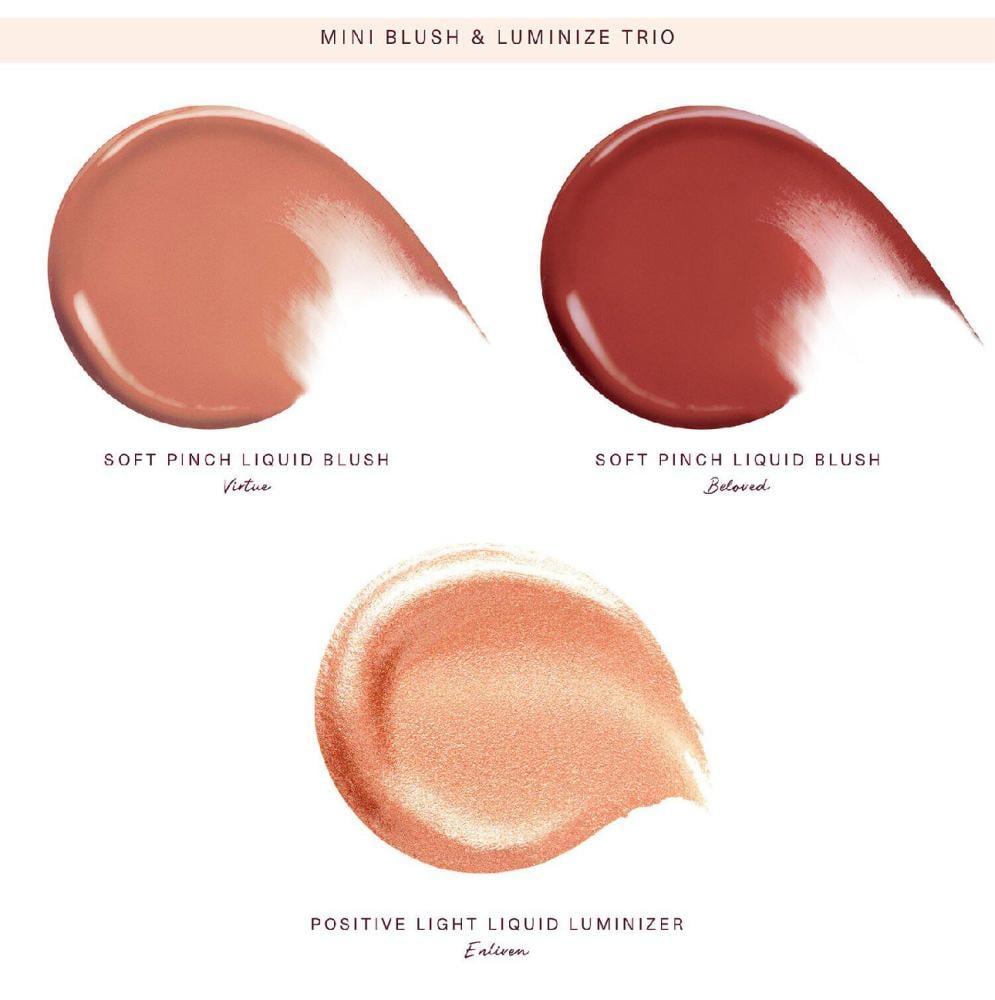 • 3 قطع ميني: تشمل درجتين من أحمر الخدود السائل ودرجة واحدة من الهايلايتر السائل.